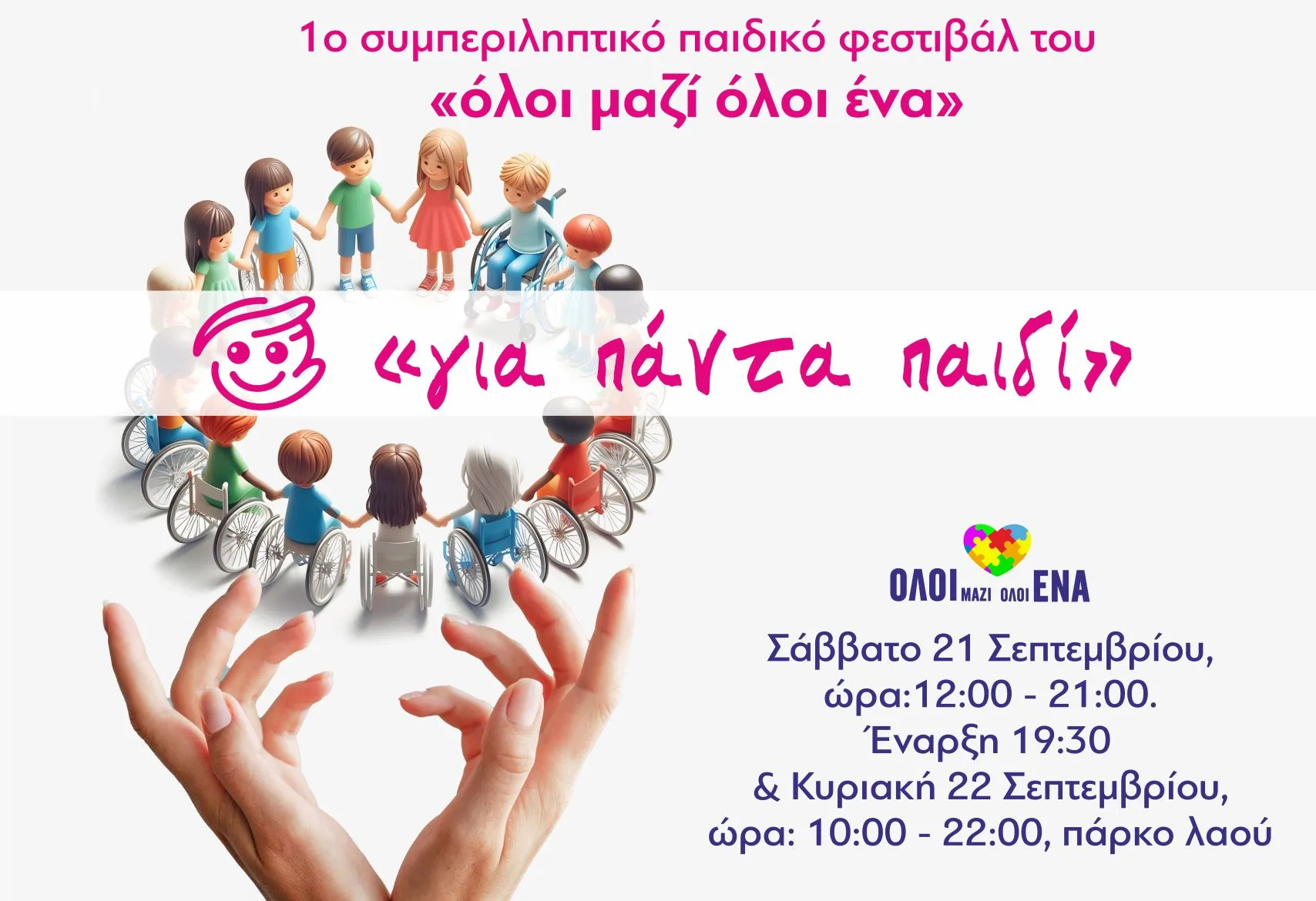 Ο Δήμος Χαλκιδέων, με αφορμή τη συμπλήρωση 1 έτους λειτουργίας του Γραφείου ΑμεΑ, διοργανώνει το 1ο Συμπεριληπτικό Παιδικό Φεστιβάλ Χαλκίδας «Για πάντα παιδί», το Σάββατο 21 Σεπτεμβρίου και την Κυριακή 22 Σεπτεμβρίου 2024, στο Πάρκο του Λαού, υπό την αιγίδα της UNICEF και με τη συνεργασία και στήριξη Σχολείων, Φορέων, Συλλόγων, Σωματείων, Εταιρειών και εθελοντικών οργανώσεων.