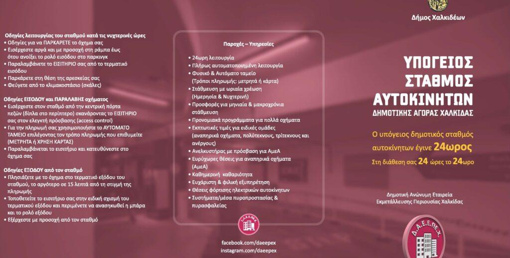 Σε 24ωρη λειτουργία τέθηκε, από τον Δήμο Χαλκιδέων, ο υπόγειος σταθμός αυτοκινήτων στην πλατεία Εμπόρων, στη Δημοτική Αγορά Χαλκίδας, και πλέον πολίτες και επισκέπτες μπορούν να εξυπηρετούνται όλη την ημέρα.