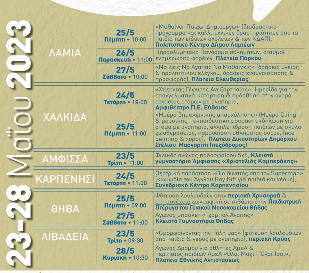• Αγώνας δρόμου για ΑμεΑ με διαδρομές των 700μ. και των 5.000μ. (σύνδεσμος εγγραφών: event.athletopia.com/oloimazioloiisoi2023?step=1).