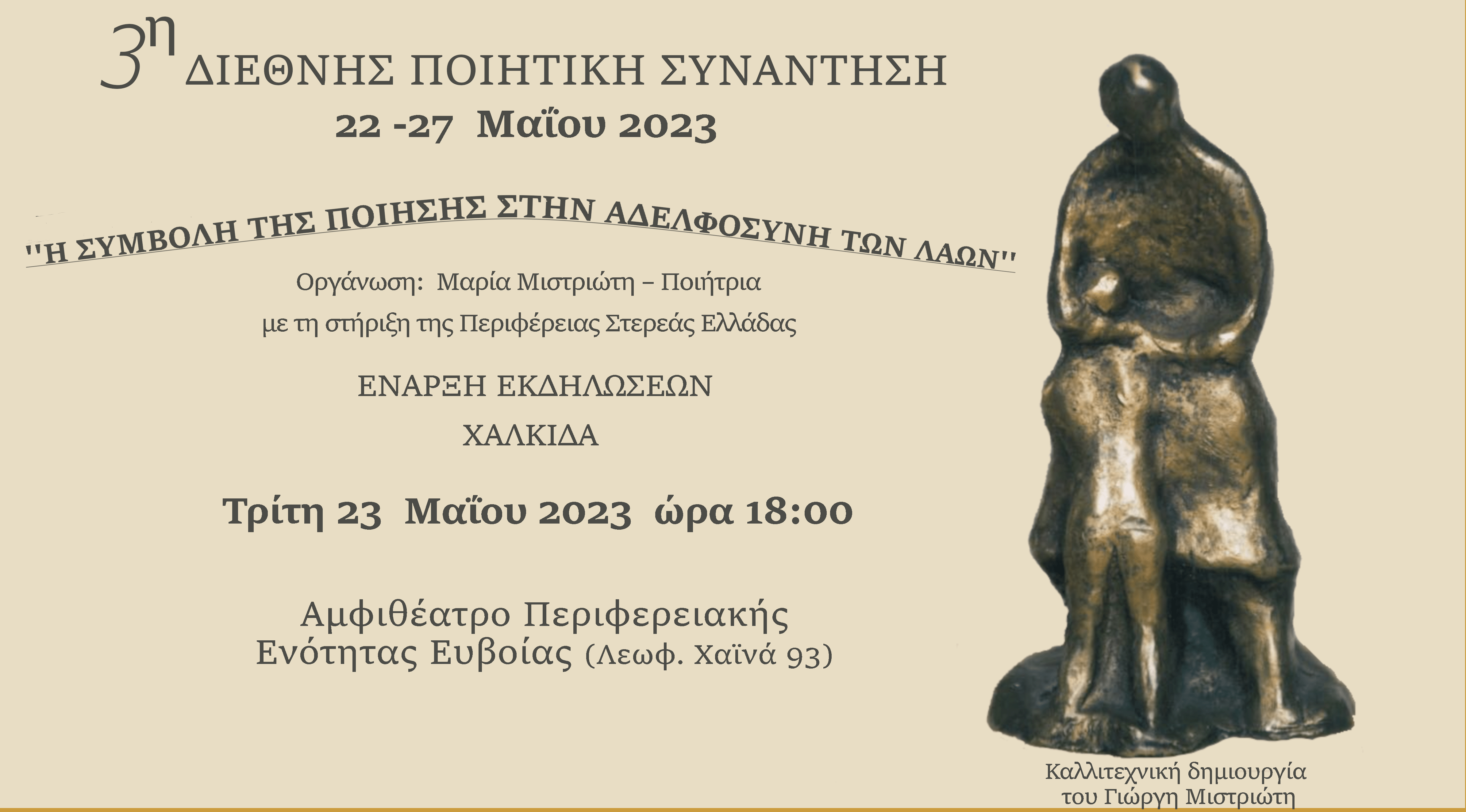 Η 3η Διεθνή Ποιητική Συνάντηση θα διεξαχθεί στην Χαλκίδα, από τις 22-27 Μαΐου 2023, η οποία διοργανώνεται από την Περιφέρεια Στερεάς Ελλάδας σε συνεργασία με την Ποιήτρια Μαρία Μιστριώτη. Η Έναρξη της Ποιητικής Συνάντησης θα πραγματοποιηθεί την Τρίτη 23 Μαΐου 2023 και ώρα 18.00 στο Αμφιθέατρο της Περιφερειακής Ενότητας Εύβοιας.