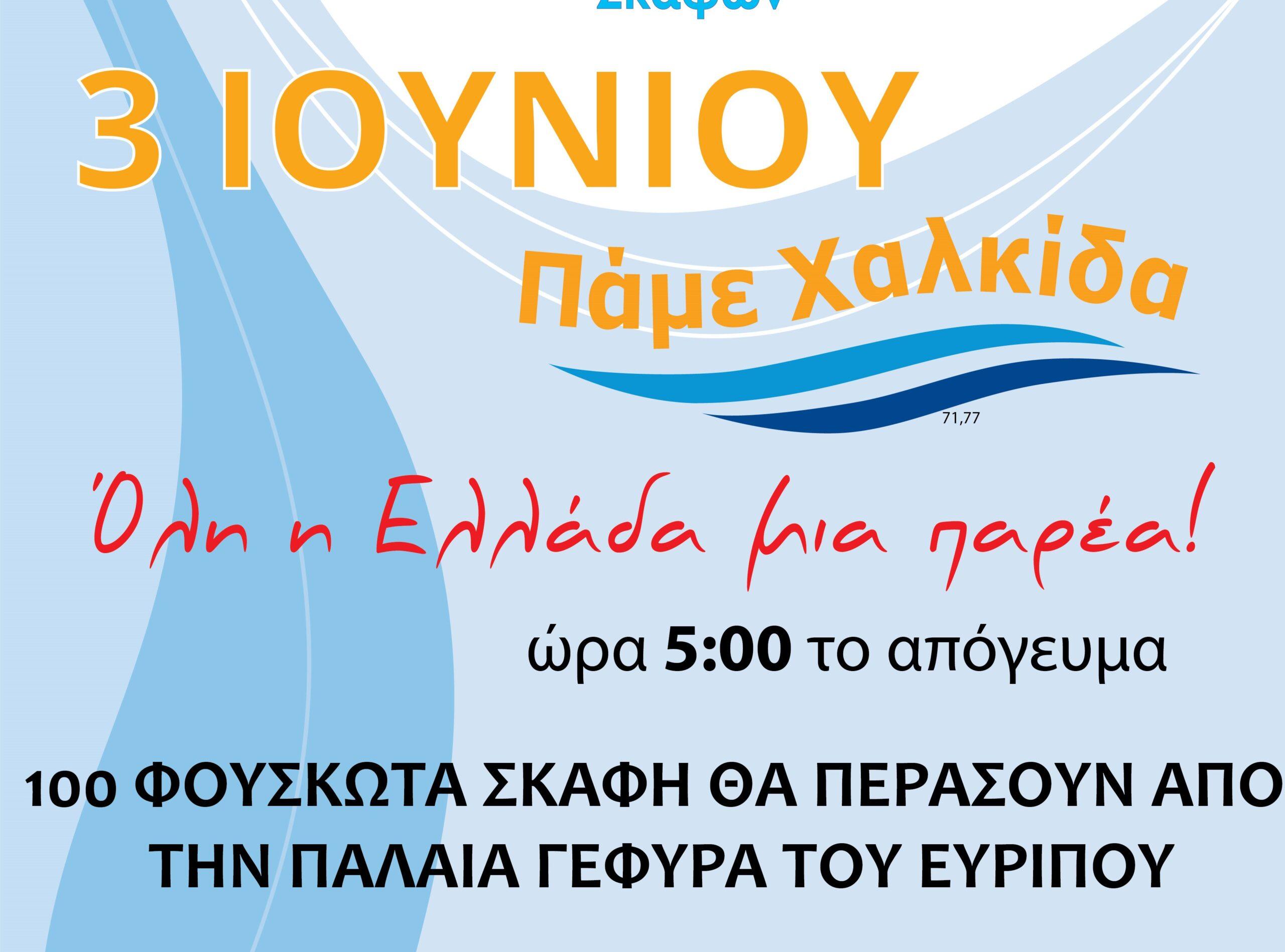 Ο Ευβοϊκός Όμιλος Φουσκωτών Σκαφών διοργανώνει την 15η Πανελλήνια Συνάντηση Ομίλων Φουσκωτών Σκαφών στην πόλη της Χαλκίδας το Σάββατο 3 Ιουνίου 2023 όπου 80 – 100 Φουσκωτά Σκάφη από όλη την Ελλάδα θα Περάσουν από την Παλαιά Γέφυρα του Ευρίπου.