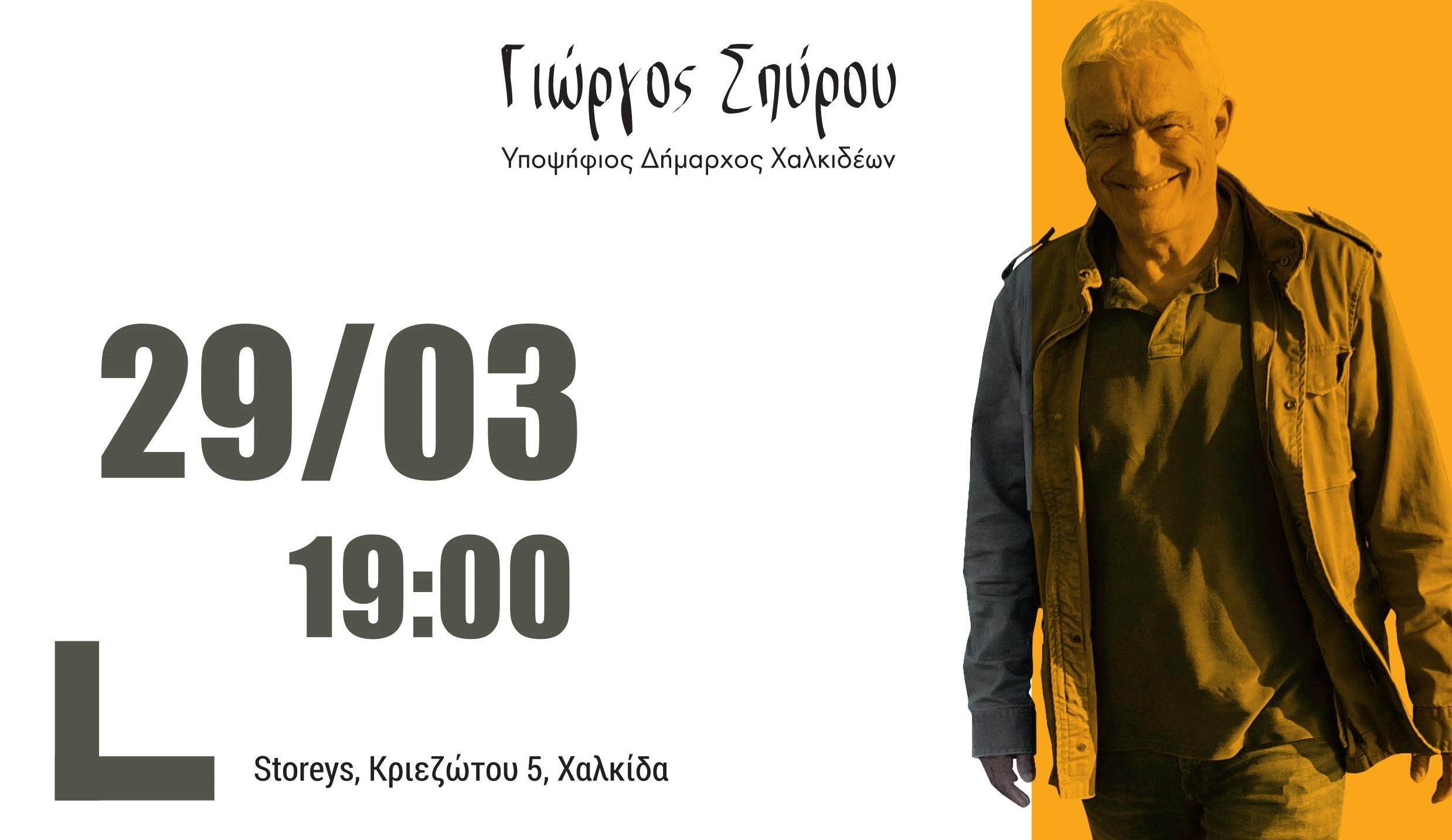 Ο υποψήφιος Δήμαρχος Χαλκιδέων Γιώργος Σπύρου, πραγματοποιεί την πρώτη ανοιχτή εκδήλωση της δημοτικής του κίνησης την Τετάρτη 29/3 στο Storeys στη Χαλκίδα. Θα παρουσιαστεί η ιδρυτική διακήρυξη και ο κ. Σπύρου θα απαντήσει σε ερωτήσεις των δημοσιογράφων και των δημοτών.