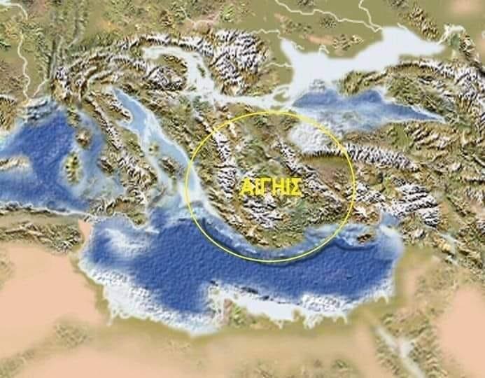 Αιγηίδα ήταν η ενιαία ξηρά που η τεράστια έκτασή της κάλυπτε την Ηπειρωτική Ελλάδα, το Αιγαίο πέλαγος από τις ακτές του Αδρέα (εξού και Αδριατική) μέχρι την Ιωνία. Νότια κατέβαινε μέχρι Κύπρο και Κρήτη και κάτω από την Κρήτη ενώνονταν μέχρι την Βόρεια Αφρική. Το σημείο που ενώνονταν, ονομαζόταν “Μέση Γή”.