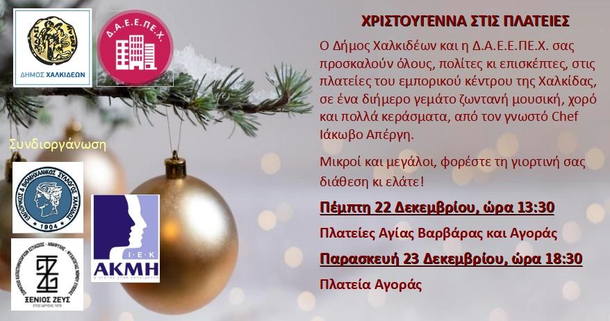 Σε Χριστουγεννιάτικα χωριά, γεμάτα από μελωδίες, κεράσματα, γλυκίσματα και πολλές δράσεις για όλη την οικογένεια, μετατρέπουν ο Δήμος Χαλκιδέων και η Δημοτική Ανώνυμη Επιχείρηση Εκμετάλλευσης Περιουσίας Χαλκίδας (Δ.Α.Ε.Ε.ΠΕ.Χ), τις πλατείες Αγίας Βαρβάρας και Αγοράς στη Χαλκίδα, σε συνεργασία με τον Εμπορικό και Βιομηχανικό Σύλλογο Χαλκίδας, το Σωματείο Καταστηματαρχών Εστίασης Ν. Εύβοιας «ΞΕΝΙΟΣ ΖΕΥΣ» και το Ι.Ε.Κ ΑΚΜΗ.