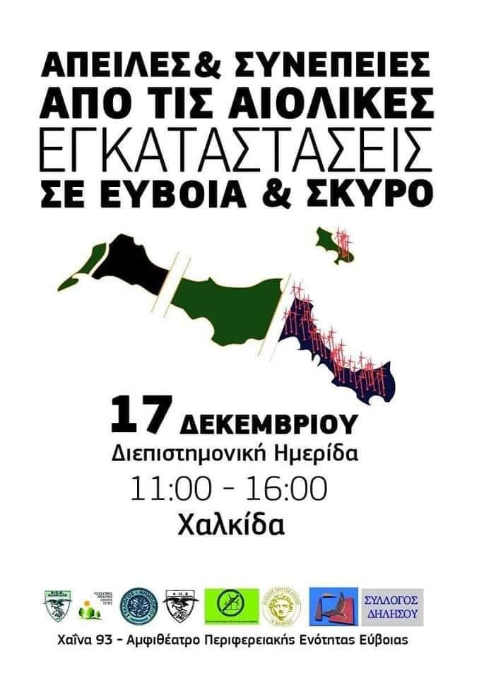 Μετά την εμβληματική κινητοποίηση της 13ης Νοεμβρίου στην Χαλκίδα, ενάντια στην καταστροφή της Εύβοιας και της Σκύρου από την επέλαση των αιολικών σταθμών, ο αγώνας συνεχίζεται με την επιστημονική ημερίδα που διοργανώνεται το Σάββατο 17 Δεκεμβρίου 2022.