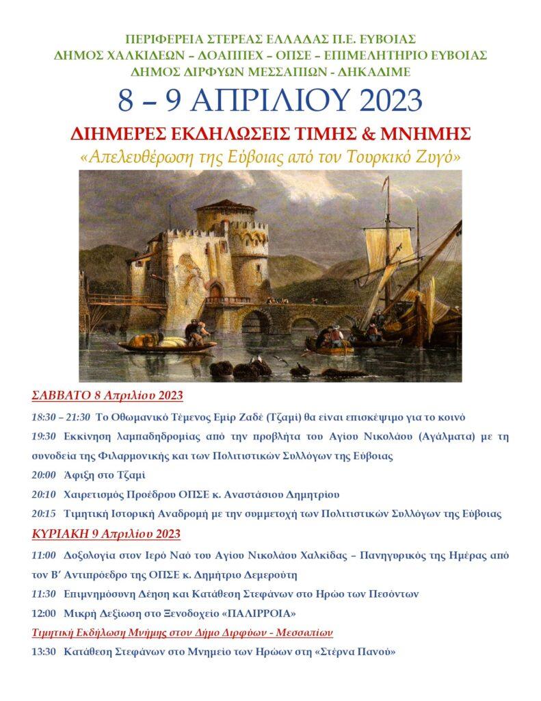 Η Ομοσπονδία Πολιτιστικών Συλλόγων Ευβοίας σε συνεργασία με τον Δήμο Χαλκιδεών, τον ΔΟΑΠΠΕΧ, το Επιμελητήριο Ευβοίας, τον Δήμο Διρφύων-Μεσσαπίων και την ΔΗΚΑΔΙΜΕ, υπό την αιγίδα της Περιφέρειας Στερεάς Ελλάδας Π.Ε. Ευβοίας πραγματοποιεί το Σάββατο 08 και την Κυριακή 09 Απριλίου 2023 τις Τιμητικές Εκδηλώσεις Μνήμης για την Απελευθέρωση της Εύβοιας από τον Τουρκικό Ζυγό.