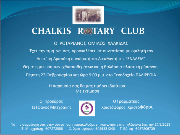 Την Πέμπτη 23/2/2023 στο ξενοδοχείο «ΠΑΛΙΡΡΟΙΑ» ο Ροταριανός ̈Όμιλος Χαλκίδας στο πλαίσιο των