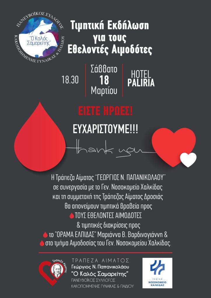 Η ”ΤΡΑΠΕΖΑ ΑΙΜΑΤΟΣ ΓΕΩΡΓΙΟΣ Ν. ΠΑΠΑΝΙΚΟΛΑΟΥ” του Πανευβοϊκού Συλλόγου “Ο ΚΑΛΟΣ ΣΑΜΑΡΕΙΤΗΣ” σε συνεργασία με το Γεν.Νοσοκομείο Χαλκίδας και την Τράπεζα Αίματος Δροσιάς, θα πραγματοποιήσει το Σάββατο 18 Μαρτίου 2023 εκδήλωση για τους Εθελοντές Αιμοδότες, τιμώντας τους για τη σπουδαία και σημαντική ανθρωπιστική προσφορά τους.