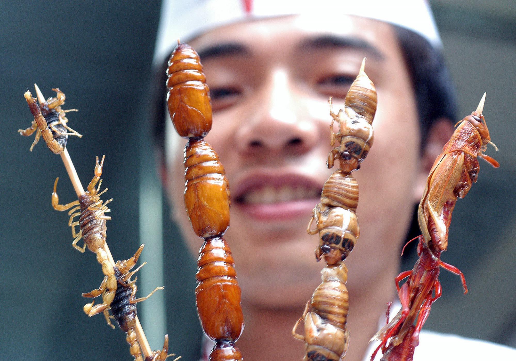 A vendor displays deep fried skewered scorpions, left, cicadas, right, and other insects he sells at a snack stand in Beijing Friday Sept. 27, 2002. Many Chinese believe eating the insects, which sell for up to 8 Yuan (US$1.00) each, is good for their health. (AP Photo)