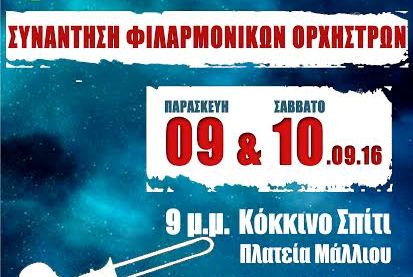 Ο ΔΟΑΠΠΕΧ στα πλαίσια των εκδηλώσεων «ΕΥΡΙΠΕΙΑ 2016» διοργανώνει διήμερο Φεστιβάλ Φιλαρμονικών Ορχηστρών, το οποίο θα τιμήσει με τη συμμετοχή της, η Φιλαρμονική Ορχήστρα της Ελληνικής Αστυνομίας και που θα πραγματοποιηθεί την Παρασκευή 9 και το Σάββατο 10 Σεπτεμβρίου 2016, με ώρα έναρξης 21.00, στην πλατεία Μάλλιου (Κόκκινο Σπίτι). Είσοδος ελεύθερη. Το πρόγραμμα του Φεστιβάλ έχει ως εξής:
