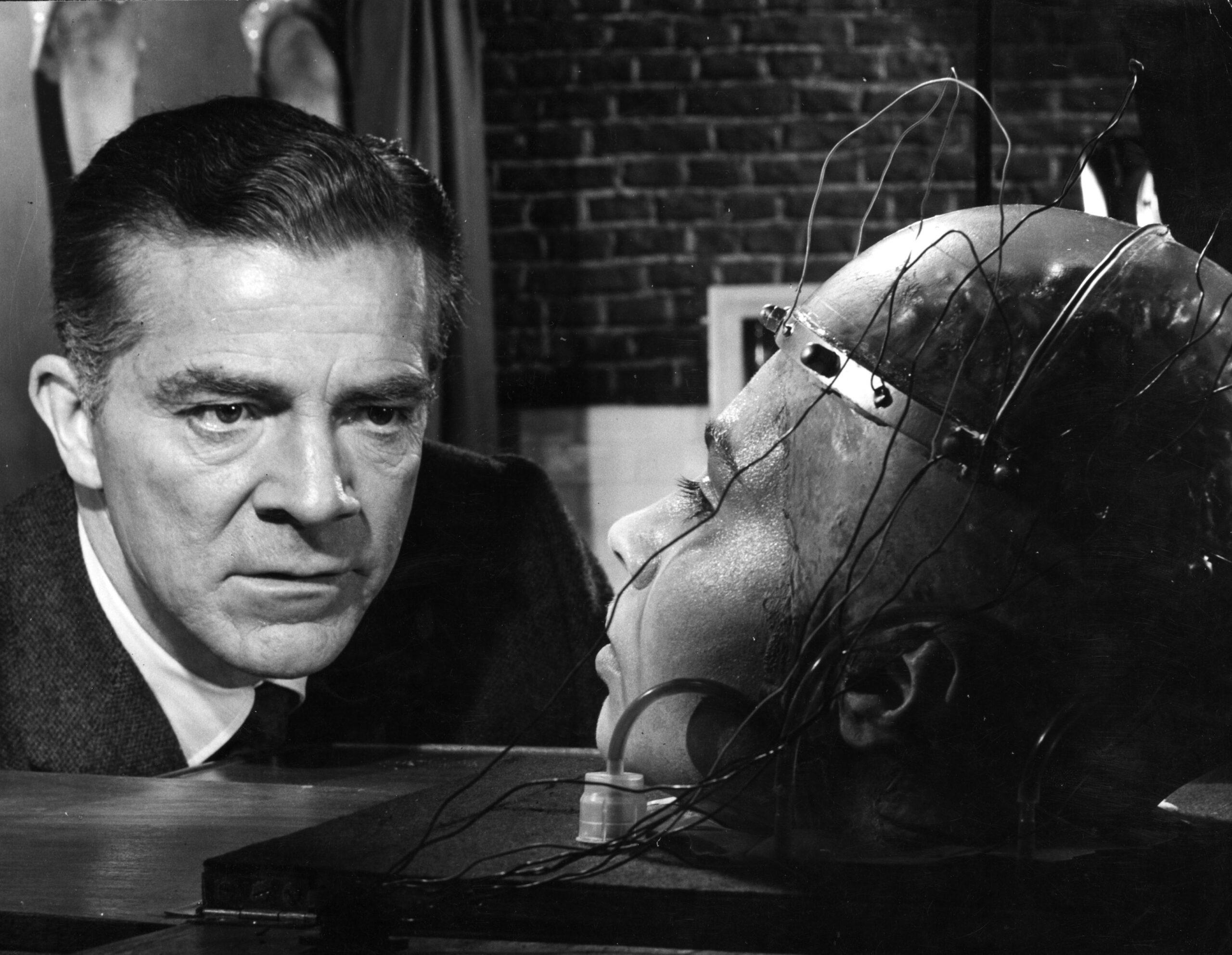 1966: Kathleen Breck as the college girl whose severed head is kept alive for experimental purposes, and Dana Andrews as the sinister Nazi scientist Dr Norberg, in a scene from the film 'The Frozen Dead'. (Photo by Keystone Features/Getty Images)