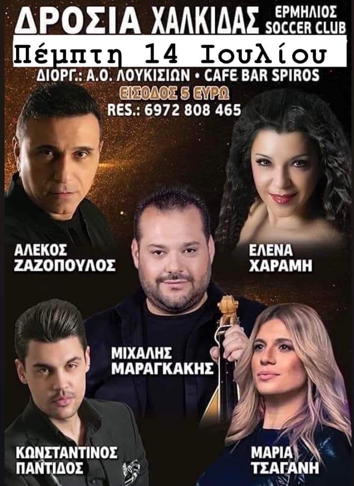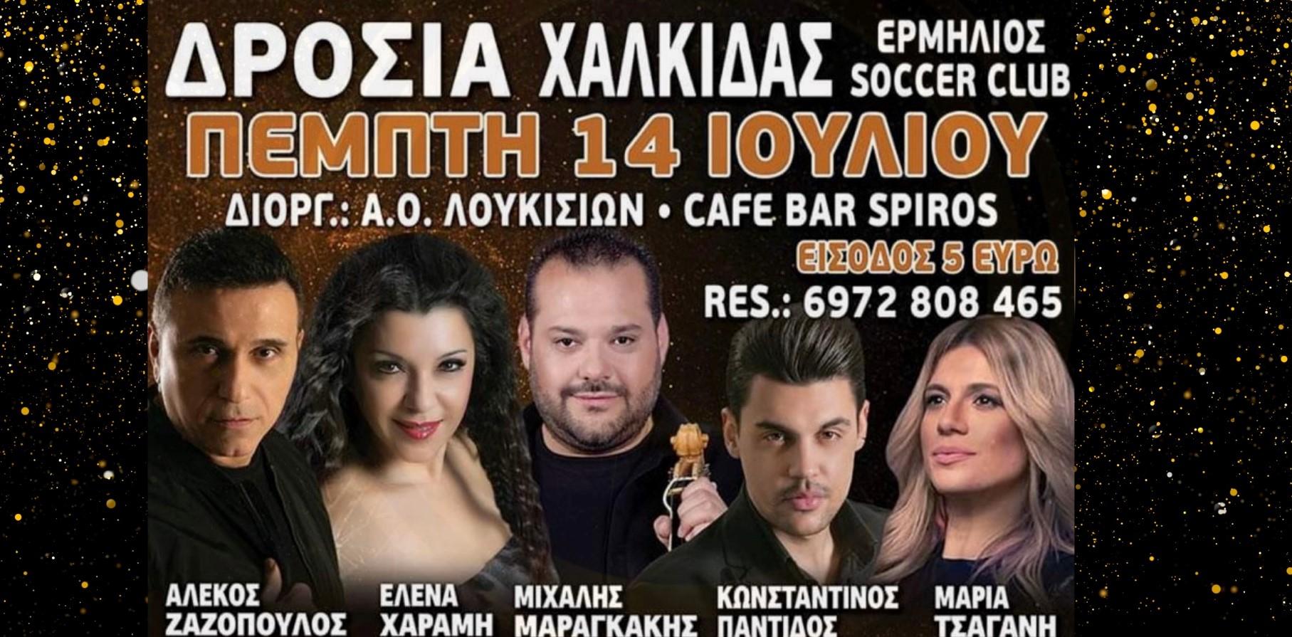 Μεγάλο πανηγύρι διοργανώνει ο ΑΟ ΛΟΥΚΙΣΙΩΝ και το Cafe Bar Spiros στη Δροσιά Χαλκίδας, στα γήπεδα 5χ5 ΕΡΜΗΛΙΟ, την Πέμπτη 14 Ιουλίου. Ο Αλέκος Ζαζόπουλος, η Έλενα Χαραμή, ο Μιχάλης Μαραγκάκης, η Μαρία Τσαγάνη και ο Κωνσταντίνος Παντίδος θα σας διασκεδάσουν μέχρι τις πρώτες πρωινές ώρες. Τηλ για κρατήσεις 6972 808 465
