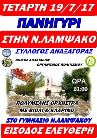 Παραδοσιακό λαϊκό γλέντι διοργανώνει ο σύλλογος ΑΝΑΞΑΓΟΡΑΣ στη Νέα Λάμψακο, την Τετάρτη 19/7/2017 παραμονή του Προφήτη Ηλία. Η εκδήλωση θα πραγματοποιηθεί στο Γυμνάσιο Ν. Λαμψακού όπου θα υπάρχει πολυμελής ορχήστρα. Στο τραγούδι θα είναι η Βέρα Γκούμα και στο κλαρίνο ο Χρήστος Μαρμαρινός. Είσοδος Ελεύθερη.