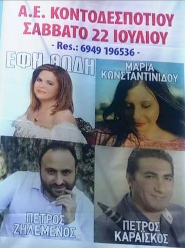 Λαϊκό γλέντι διοργανώνει η ΑΕ Κοντοδεσποτίου το Σάββατο 22 Ιουλίου. Τραγουδούν Έφη Θώδη, ο Πέτρος Ζηλεμενος και η Μαρία Κωνσταντινίδου. Στο κλαρίνο ο Πέτρος Καραίσκος και στο βιολί ο Γιώργος Λάμπρου.