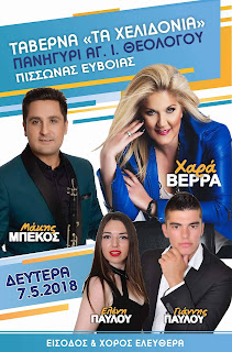 Φέτος θα εμφανιστεί η Χαρά Βέρα με την ορχήστρα της και το Μάκη Μπέκο στο κλαρίνο. Μαζί της Ο Γιάννης και η Ελένη Παύλου άξιοι συνεχιστές της οικογενειακής παράδοσης του κέντρου «Τα Χελιδόνια» . Η είσοδος και ο χορός είναι ελεύθερα. Τηλ για κρατήσεις 6981049663