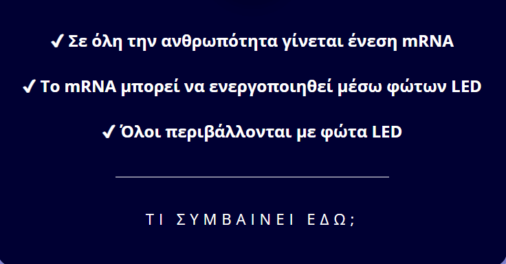 Ένα ανησυχητικό γεγονός για τις Έξυπνες Πόλεις είναι ότι όλα τα φώτα του δρόμου είναι φώτα LED, τα οποία έχουν την ικανότητα να χειρίζονται το ανθρώπινο γονιδίωμα. Η γονιδιακή έκφραση μπορεί να απενεργοποιηθεί ή να ενεργοποιηθεί με φώτα LED, τα οποία μπορούν επίσης να ενεργοποιήσουν το mRNA μέσα στο ανθρώπινο σώμα. Οι επιστημονικές μελέτες που τεκμηριώνουν αυτά τα γεγονότα αφθονούν στο διαδίκτυο. Γεγονός που γεννά το ερώτημα: είναι αυτός ο λόγος που οι αρχές επιμένουν στην ένεση σε όλη την ανθρωπότητα με τεχνολογίες mRNA που μπορούν να ενεργοποιηθούν μέσω φωτός LED;