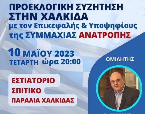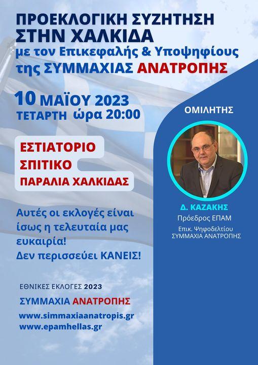 Προεκλογική συζήτηση στην ΧΑΛΚΙΔΑ πραγματοποιεί η ΣΥΜΜΑΧΙΑ ΑΝΑΤΡΟΠΗΣ την Τετάρτη 10 Μαΐου και ώρα 20:00 στο εστιατόριο ΣΠΙΤΙΚΟ, στην Παραλία της πόλης. Θα γίνει η παρουσίαση των υποψηφίων βουλευτών για την Εύβοια και στη συνέχεια θα μιλήσει ο πρόεδρος του ΕΠΑΜ και επικεφαλής του ψηφοδελτίου, Δημήτρης Καζάκης.