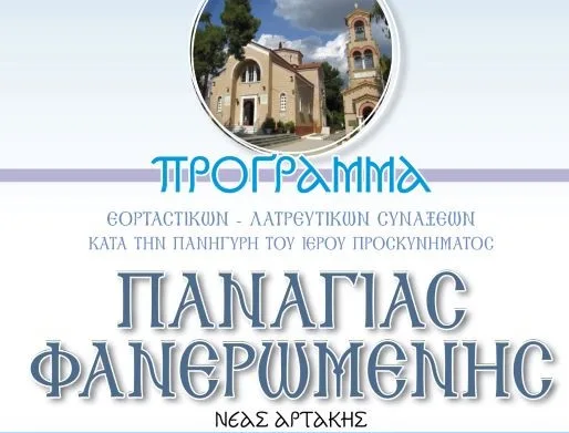 Πρόγραμμα εορτασμού του Ιερού Προσκυνήματος της Παναγίας Φανερωμένης στην Ν. Αρτάκη.