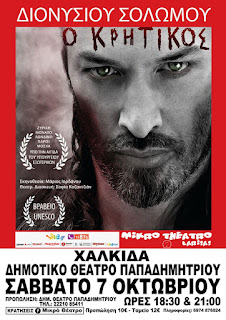 Το Μικρό Θέατρο Λάρισας φέρνει στη Χαλκίδα, το αριστουργηματικό ποίημα “Ο Κρητικός” του εθνικού ποιητή της Ελλάδας και της Κύπρου, Διονύσιου Σολωμού. Το έργο ανεβαίνει για πρώτη φορά στη θεατρική σκηνή σε σκηνοθεσία Μάριου Ιορδάνου και θεατρική διασκευή Σοφίας Καζαντζιάν και θα παιχτεί στη Χαλκίδα το Σάββατο 7 Οκτωβρίου στο ΔΗΜΟΤΙΚΟ ΘΕΑΤΡΟ ΠΑΠΑΔΗΜΗΤΡΙΟΥ.