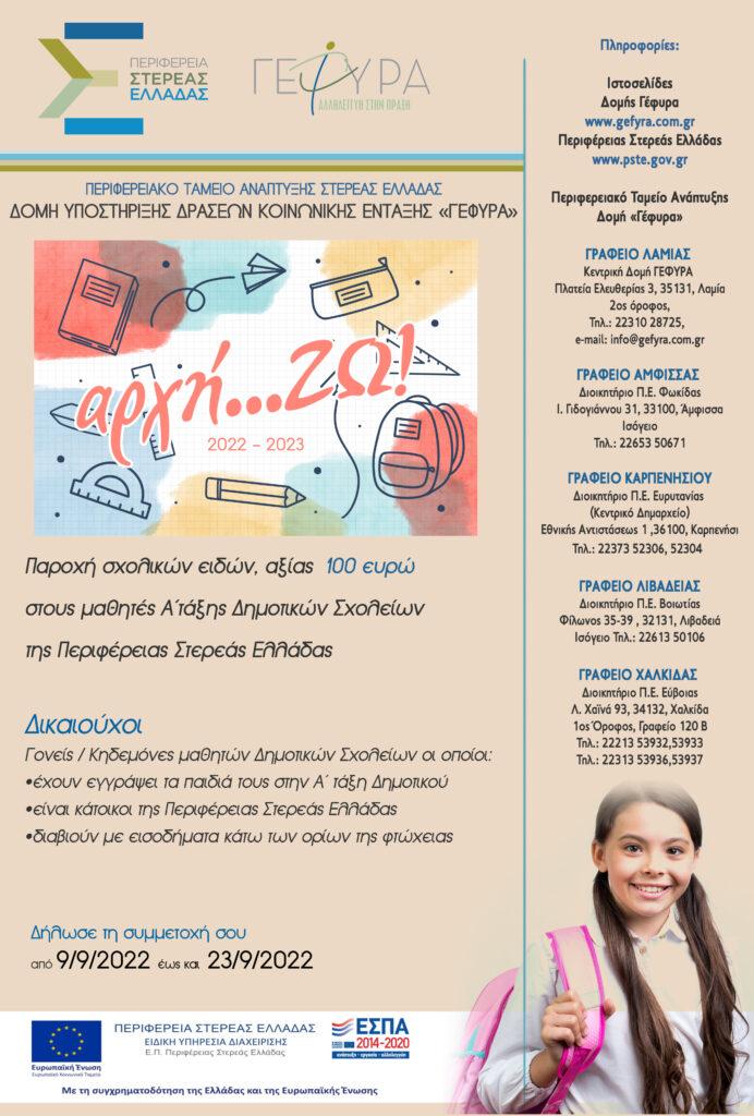 Για έκτη συνεχόμενη χρονιά η Περιφέρεια Στερεάς Ελλάδας ανακοινώνει την υλοποίηση της δράσης «αρχή…ΖΩ!» για το σχολικό έτος 2022 – 2023 σε συνεργασία με τη δομή «ΓΕΦΥΡΑ».