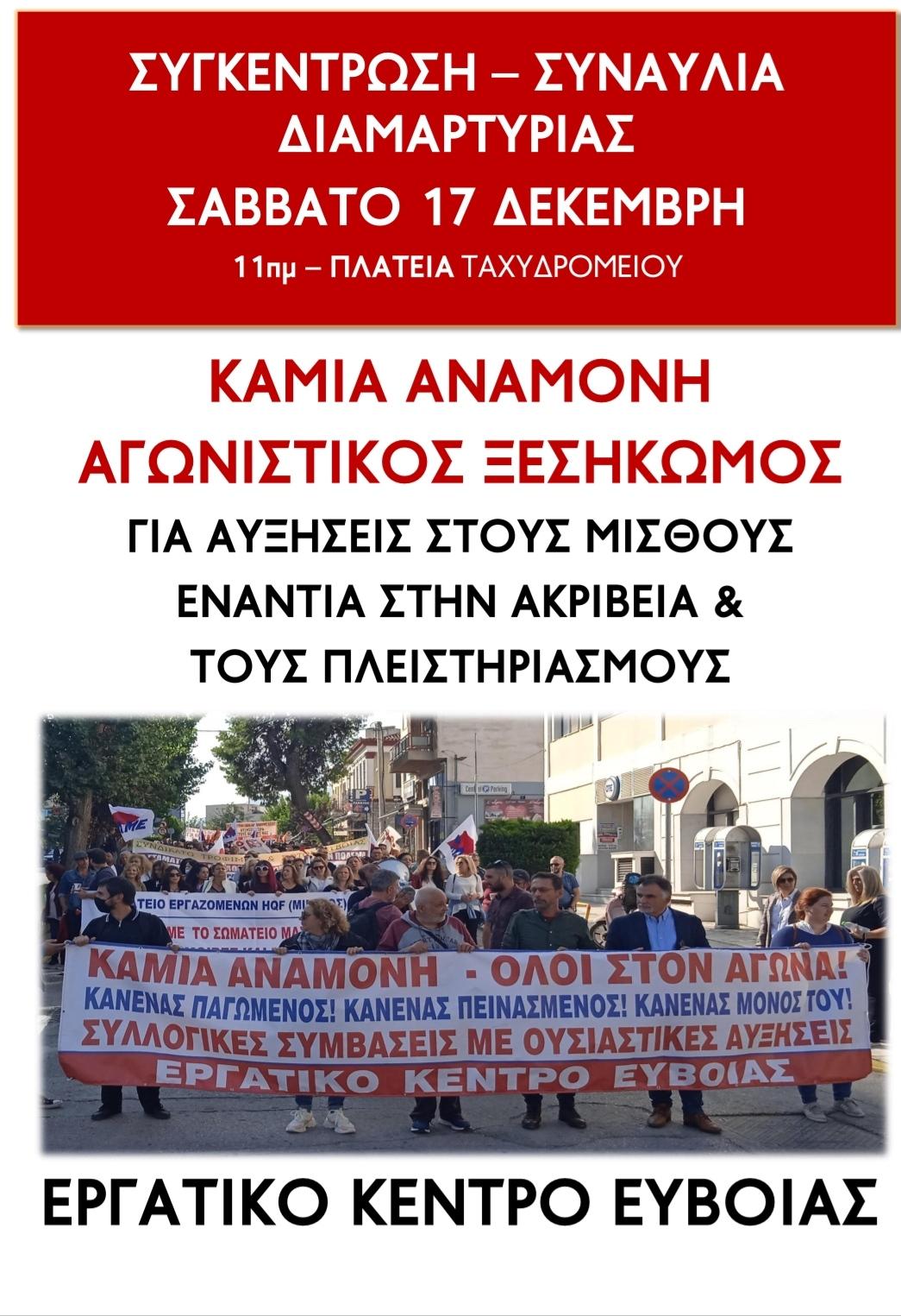 Η πετυχημένη Απεργία στις 9 Νοέμβρη και οι μεγάλες απεργιακές διαδηλώσεις που έγιναν σε όλη την Ελλάδα αλλά και σε όλη την Εύβοια, έστειλαν ηχηρό το μήνυμα κλιμάκωσης του αγώνα. Διατράνωσαν την απόφαση των εργαζομένων ότι δεν συμβιβάζονται με τη φτώχεια και την παγωνιά, ότι δεν πρόκειται να πεθάνουν για τα κέρδη των επιχειρηματικών ομίλων, ότι το λογαριασμό της ακρίβειας θα τον στείλουν σε αυτούς και στην κυβέρνηση.