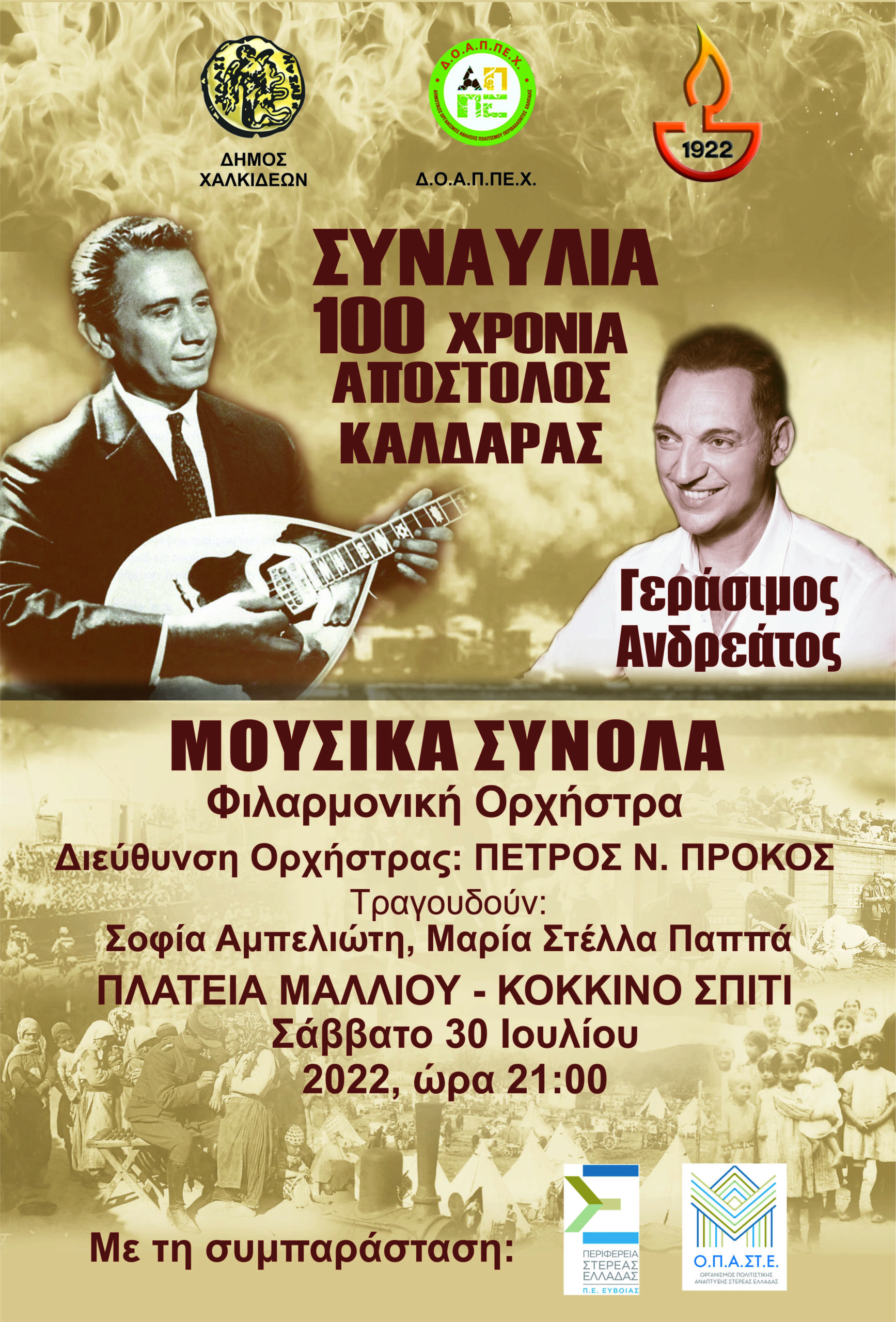 Στο πλαίσιο των εκδηλώσεων «100 Χρόνια Εθνικής Μνήμης», το Σάββατο 30 Ιουλίου, ώρα 21:00, στην Πλατεία Μάλλιου (Κόκκινο Σπίτι), ο Δήμος Χαλκιδέων και ο ΔΟΑΠΠΕΧ, με τη συμπαράσταση της Π.Στ.Ε και του ΟΠΑΣΤΕ, ως ελάχιστο φόρο τιμής και αναγνώρισης στο έργο του σπουδαίου Έλληνα Συνθέτη, Απόστολου Καλδάρα, διοργανώνουν συναυλία με τίτλο: «100 Χρόνια Απόστολος Καλδάρας», με τα Μουσικά Σύνολα – Φιλαρμονική Ορχήστρα και τον Γεράσιμο Ανδρεάτο στο τραγούδι. Τη συναυλία θα τιμήσει με την παρουσία του, ο γυιός του, Κώστας Καλδάρας.