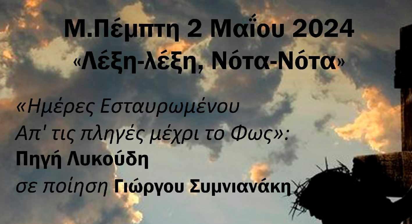 Τη Μ. Πέμπτη 2 Μαΐου 2024, βιώνουμε μία μία τις «Ημέρες Εσταυρωμένου – Απ’ τις πληγές μέχρι το Φως» έργο της Πηγής Λυκούδη σε ποίηση Γιώργου Συμνιανάκη με χορωδούς από το Φωνητικό Σύνολο “ Manus Apertae”, βυθίζοντας Νότα-Νότα καρδιά αισθήσεις και ψυχή στην καθαρτική συνθλιβή της Ιερής Ημέρας.