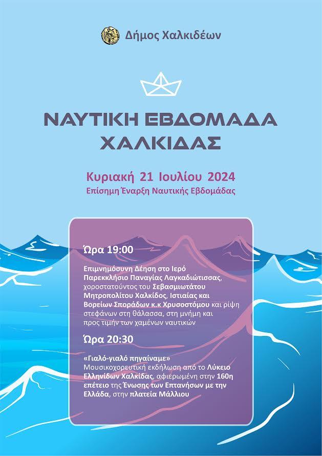 Η Ναυτική Εβδομάδα Χαλκίδας 2024 ξεκινά επίσημα την Κυριακή 21 Ιουλίου 2024 και το πρόγραμμα έχεις ως εξής: