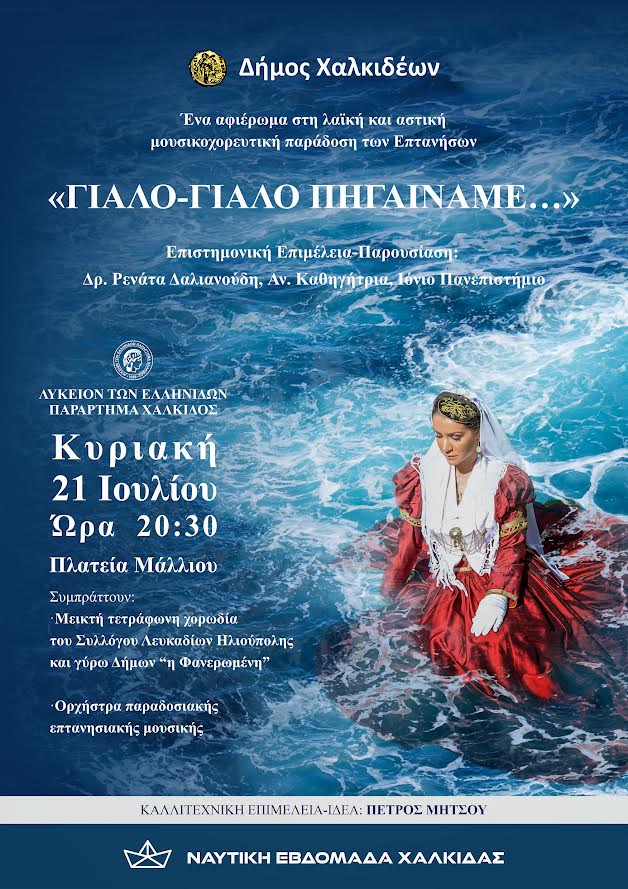 - Ώρα 20:30, «Γιαλό-γιαλό πηγαίναμε» – Μουσικοχορευτική εκδήλωση από το Λύκειο Ελληνίδων Χαλκίδας, αφιερωμένη στην 160η επέτειο της Ένωσης των Επτανήσων με την Ελλάδα, στην πλατεία Μάλλιου